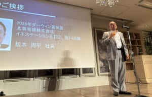会議では、本部代表・入江による「今年の振り返りと2026年に向けて」の講演に続き、各種表彰が行われました。今年のダーウィン賞は、北海道で果敢に市場へ挑戦を続ける 北章宅建株式会社 坂本社長 が受賞。ダーウィン賞は「現状維持は後退である」「常に進化発展する」という経営マインドを体現し、果敢に市場へ挑戦する加盟店に贈られる、イエステーションで最も権威ある賞です。坂本社長の挑戦の姿勢は、全国のフェローに大きな刺激を与えました。